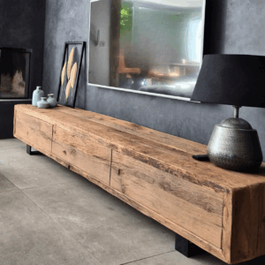 TV-Möbel aus robusten Balken mit Klappen