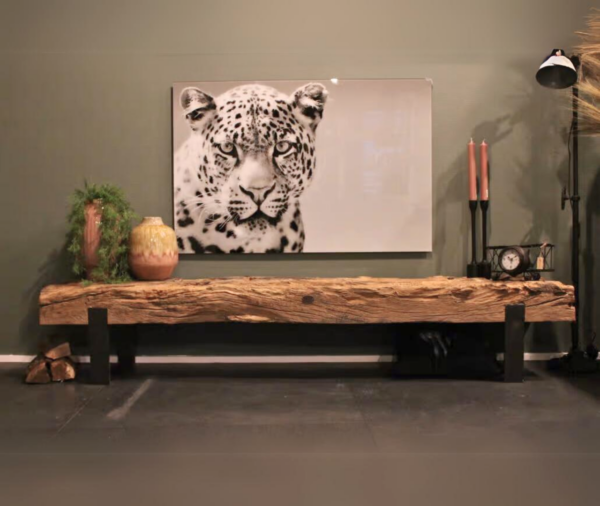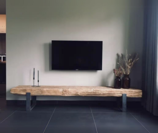 Für dieses TV-Möbel werden alte Balken verwendet, die eine authentisch gelebte Optik haben. Daher ist die Oberfläche nicht vollkommen eben, was jedoch perfekt für einen Fernseher ist, der darüber aufgehängt wird.